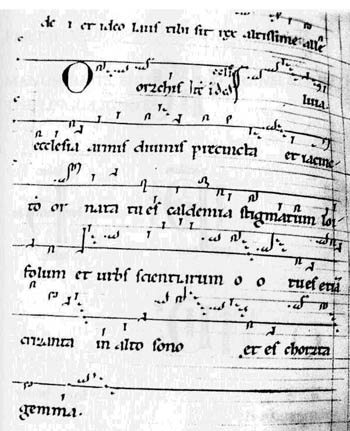O orzchis Ecclesia armis divinis praecinta, et hiacyncto ornata tu es caldemia stigmatum loifolum et urbs scienciarum. O, o tu es etiam crizanta in alto sono, et es chorzta gema.